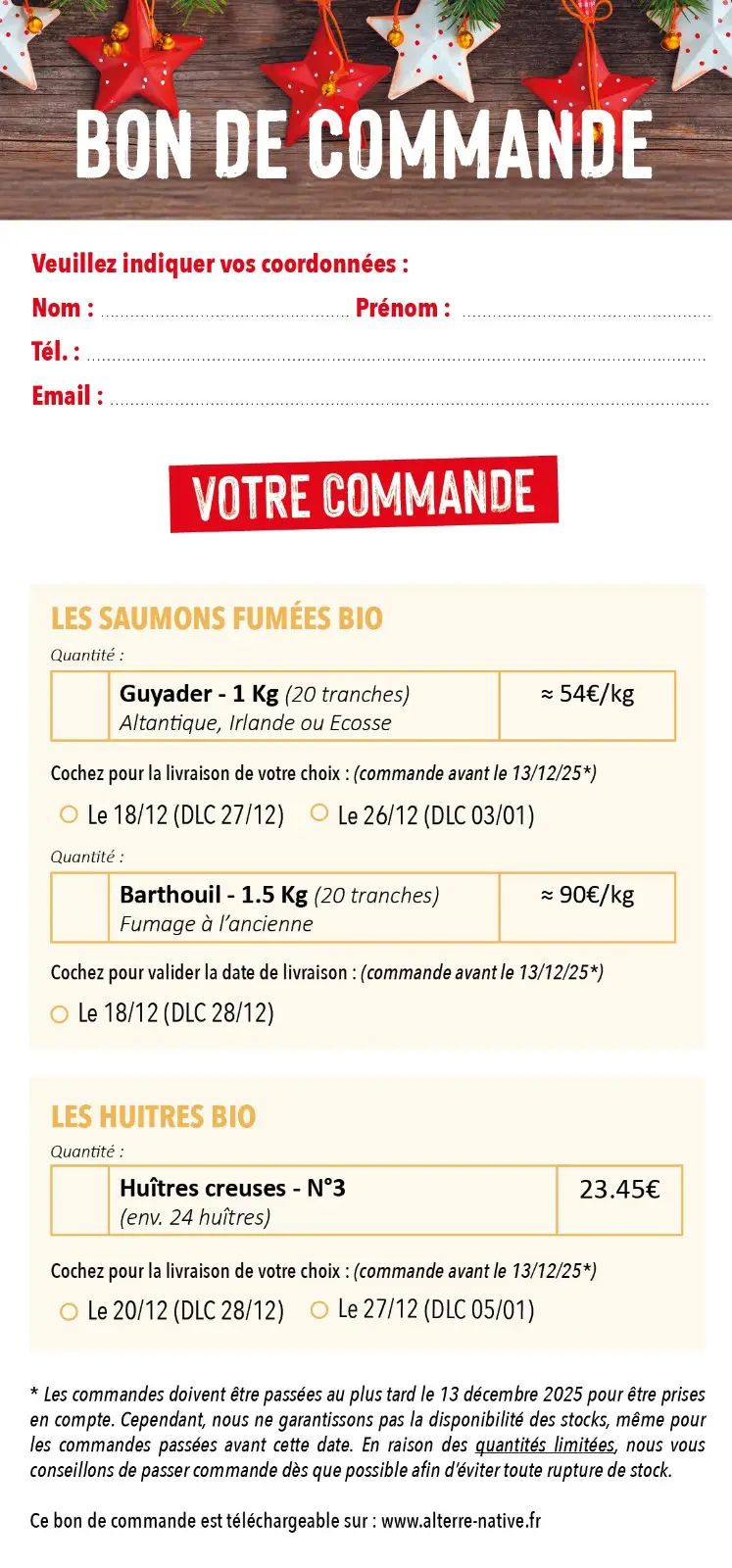 Téléchargez votre bon de commande ou récupérez-le en magasin, puis remplissez-le avec les quantités des produits souhaités (sous réserve de disponibilité, les quantités sont limitées). N’oubliez pas d’indiquer vos coordonnées pour que nous puissions vous contacter.