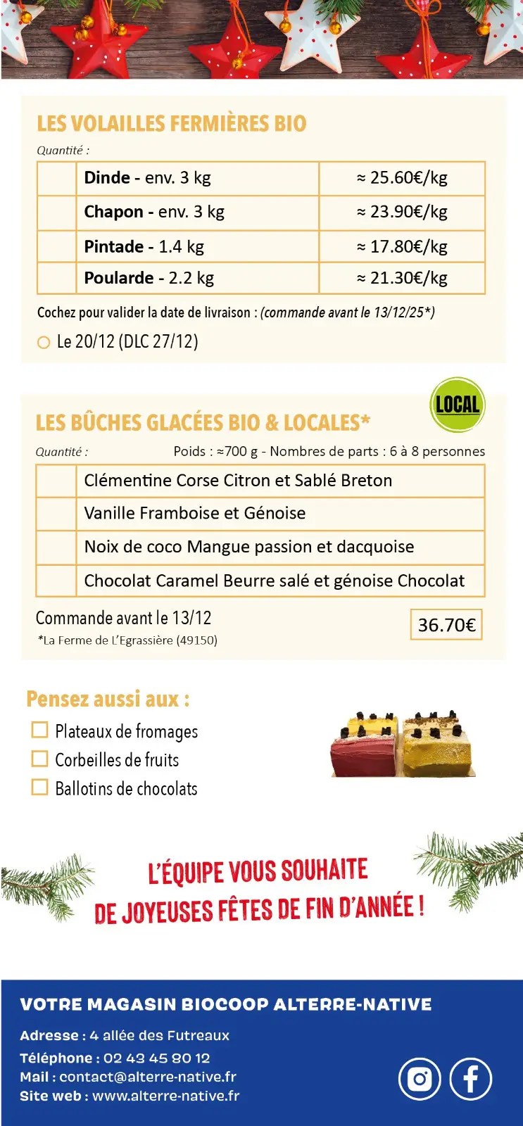 Les fêtes de fin d'année approchent, et il est temps de penser à votre repas festif. Nous vous proposons une sélection de produits bio, locaux et de qualité à commander pour vos repas de fête.
